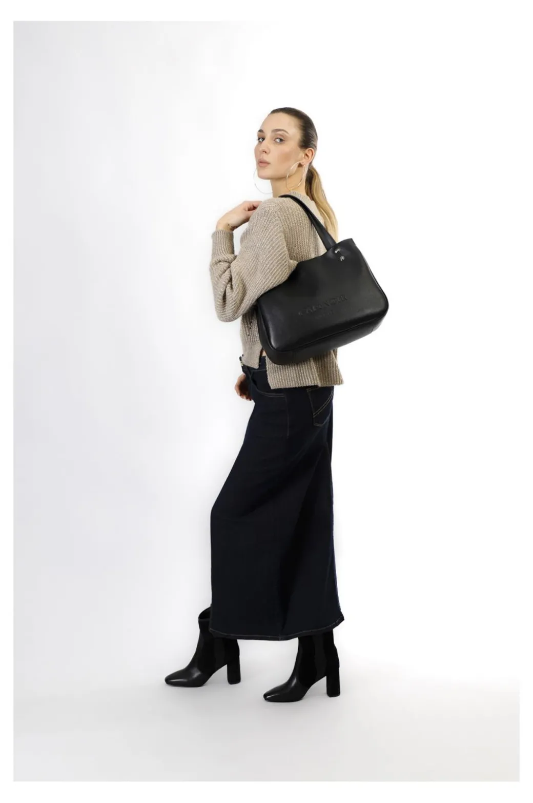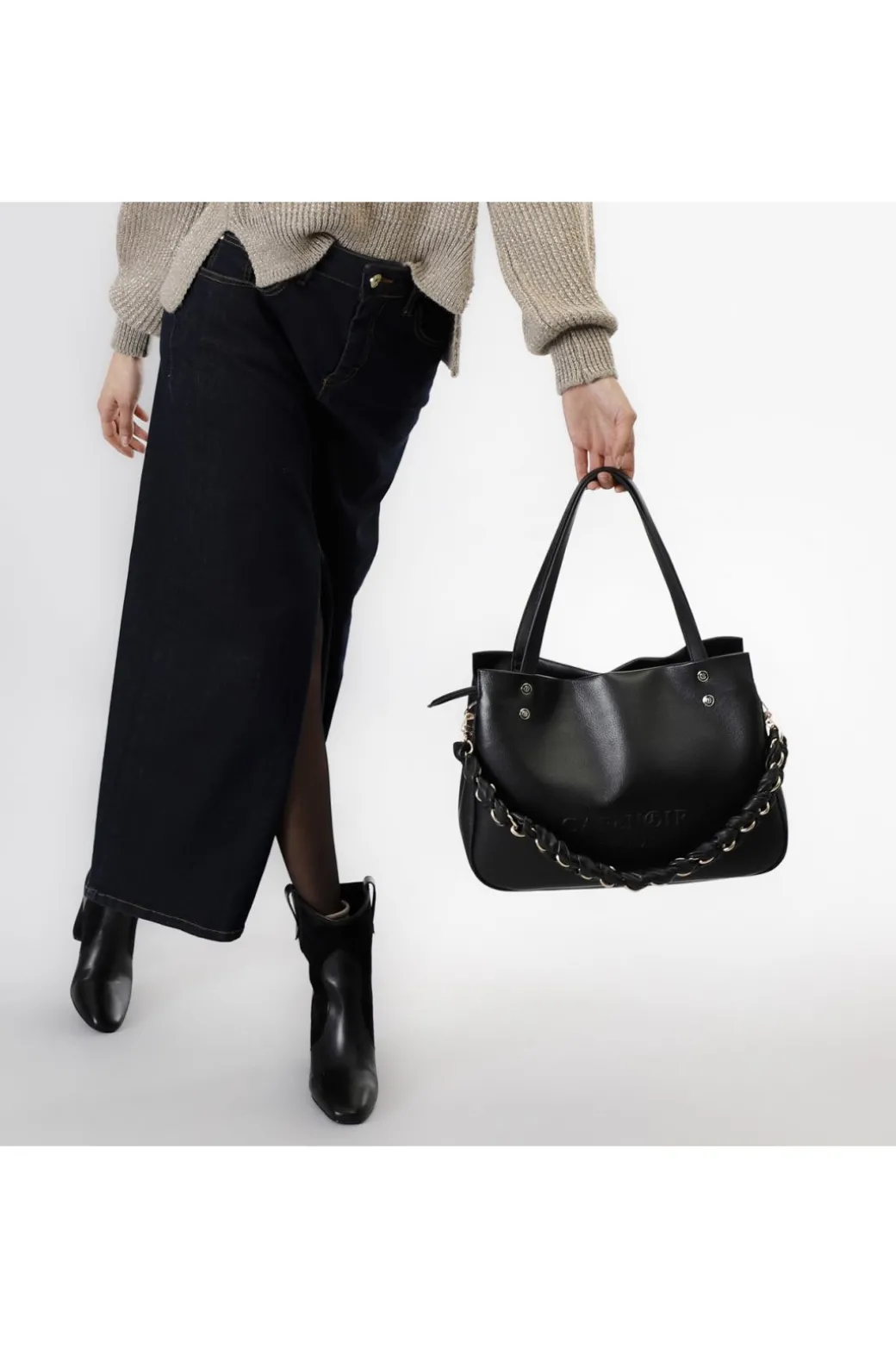 Shopping con logo cafènoir firenze in rilievo con manici lunghi e tracolla in catena intrecciata. chiusura con cerniera.