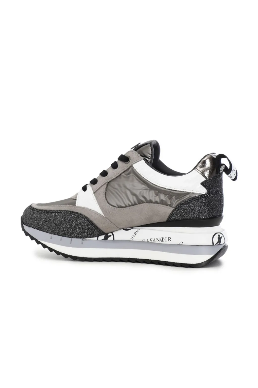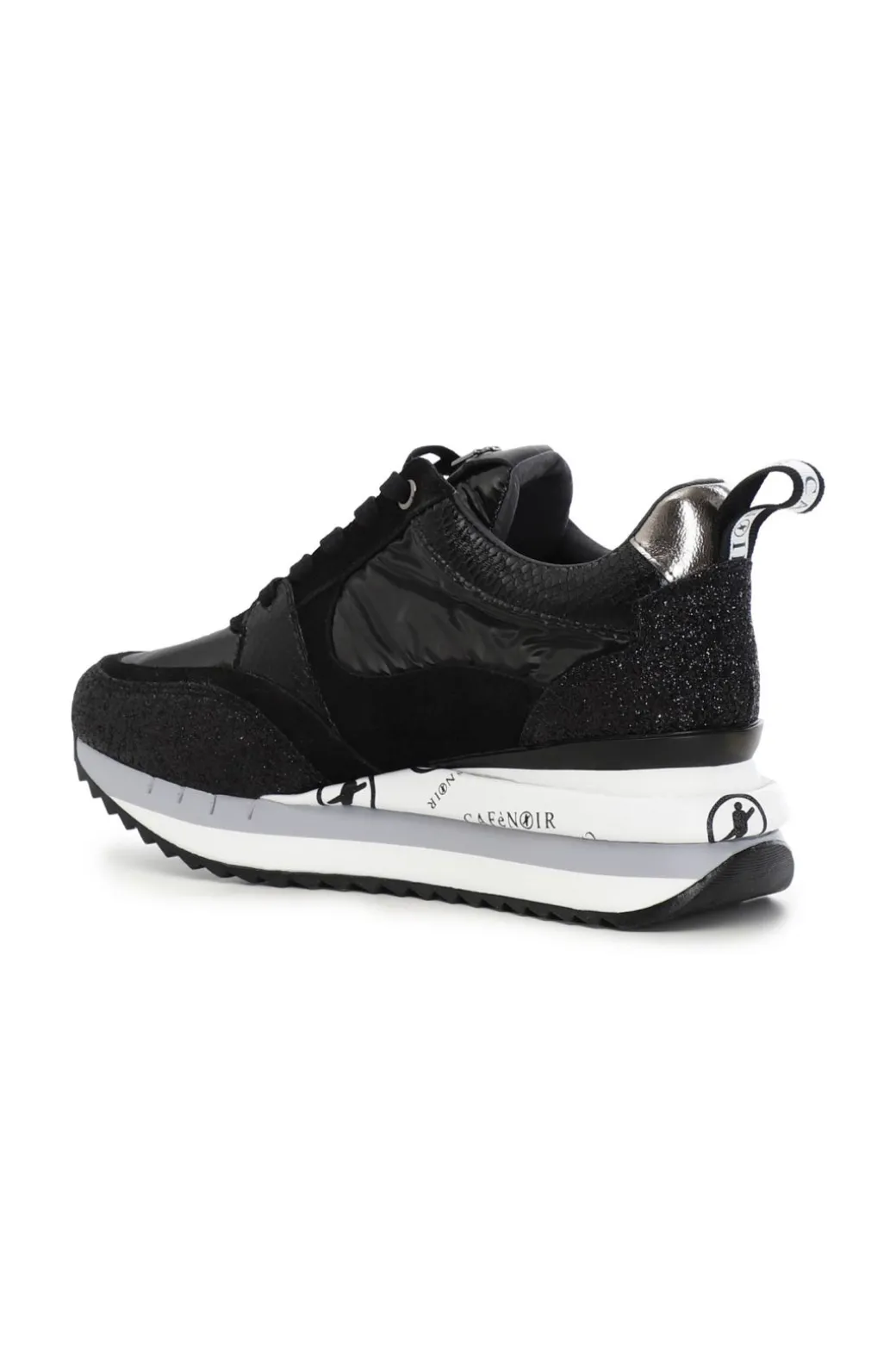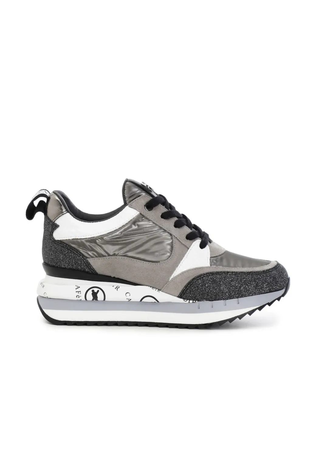 Sneakers in nylon con pelle scamosciata ed inserti glietterati e laminati. Suola rialzata personalizzata.