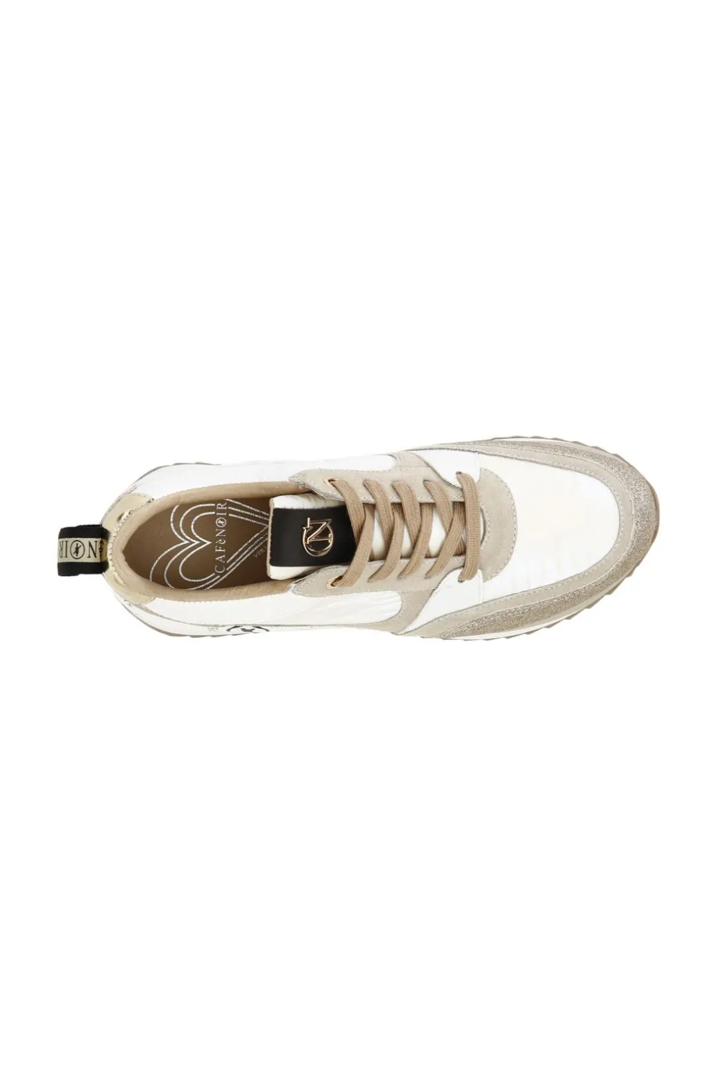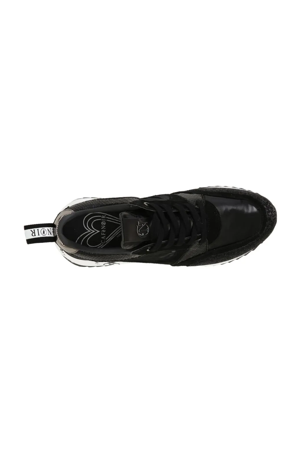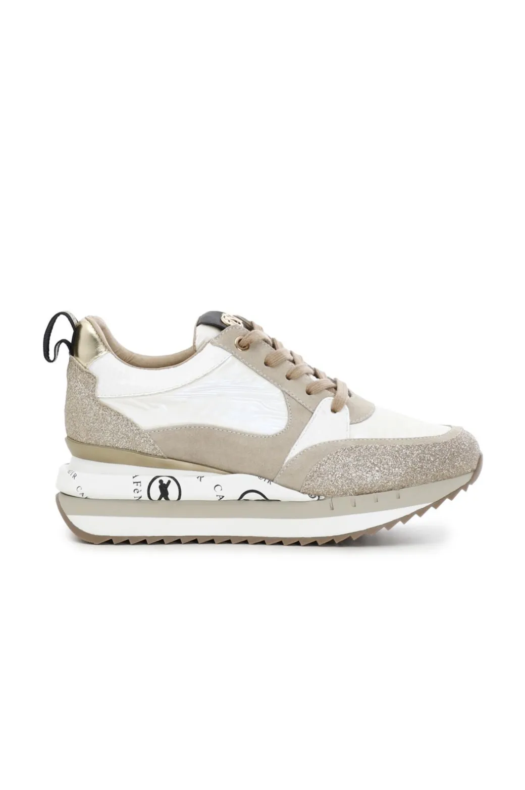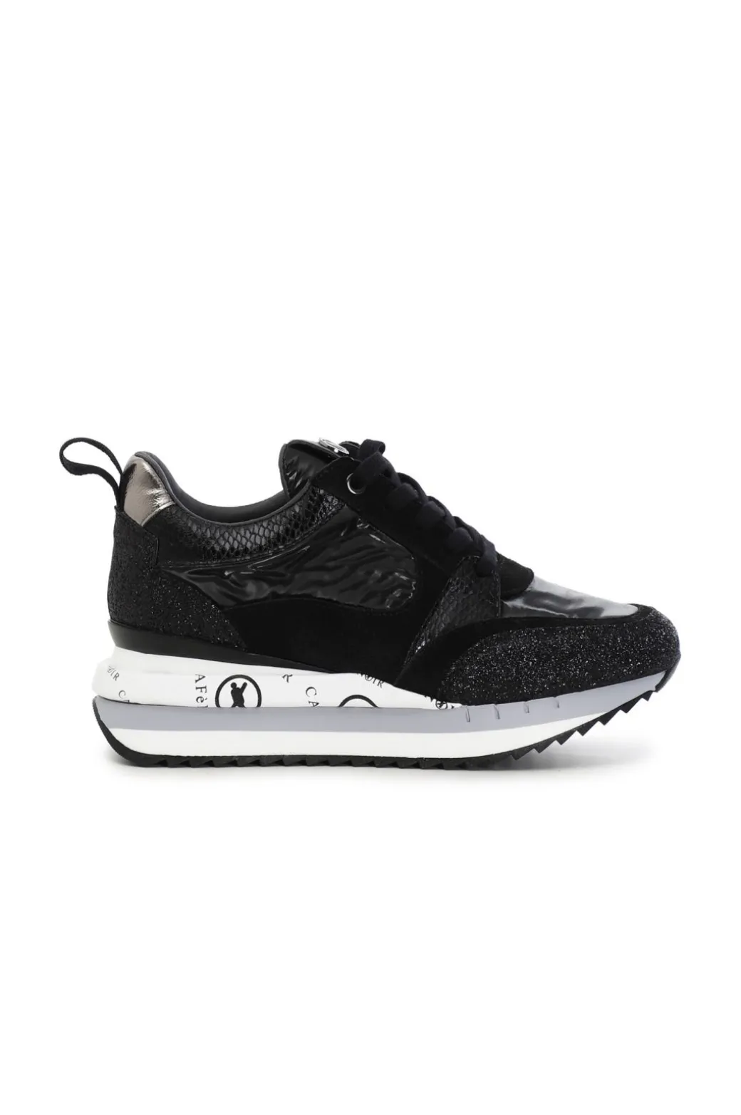 Sneakers in nylon con pelle scamosciata ed inserti glietterati e laminati. Suola rialzata personalizzata.
