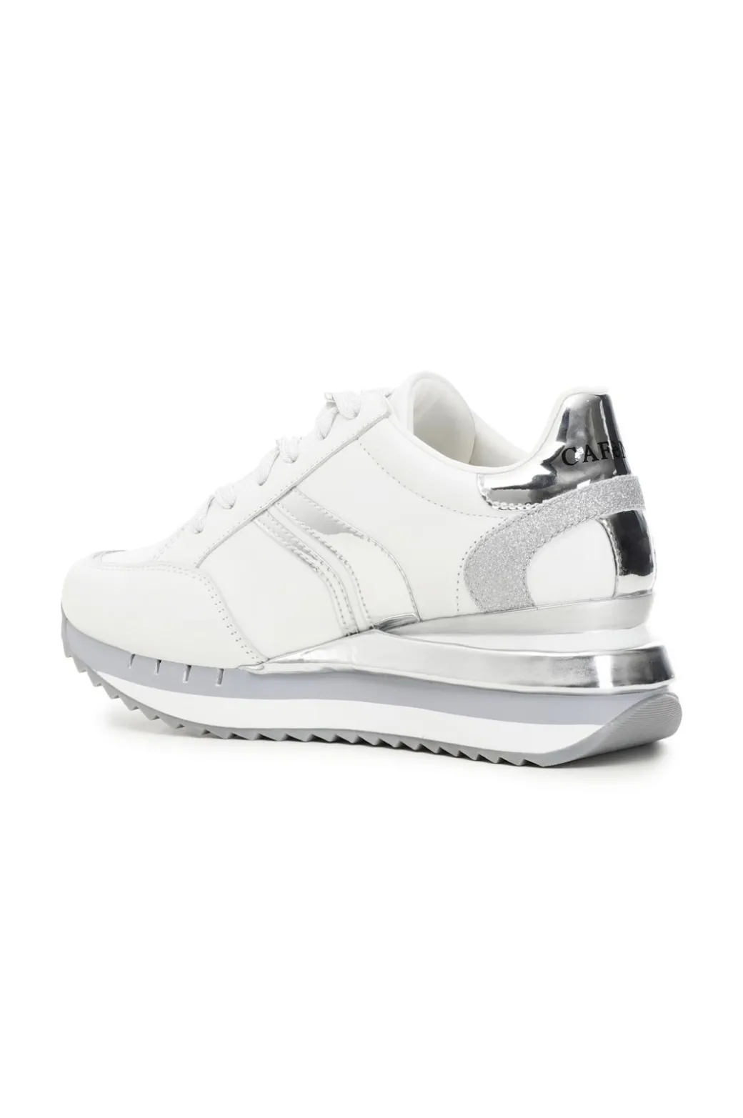 Sneakers in pelle con riporti laminati effetto specchio. Una delicata catena funge da passalaccio e decora l’allacciatura.