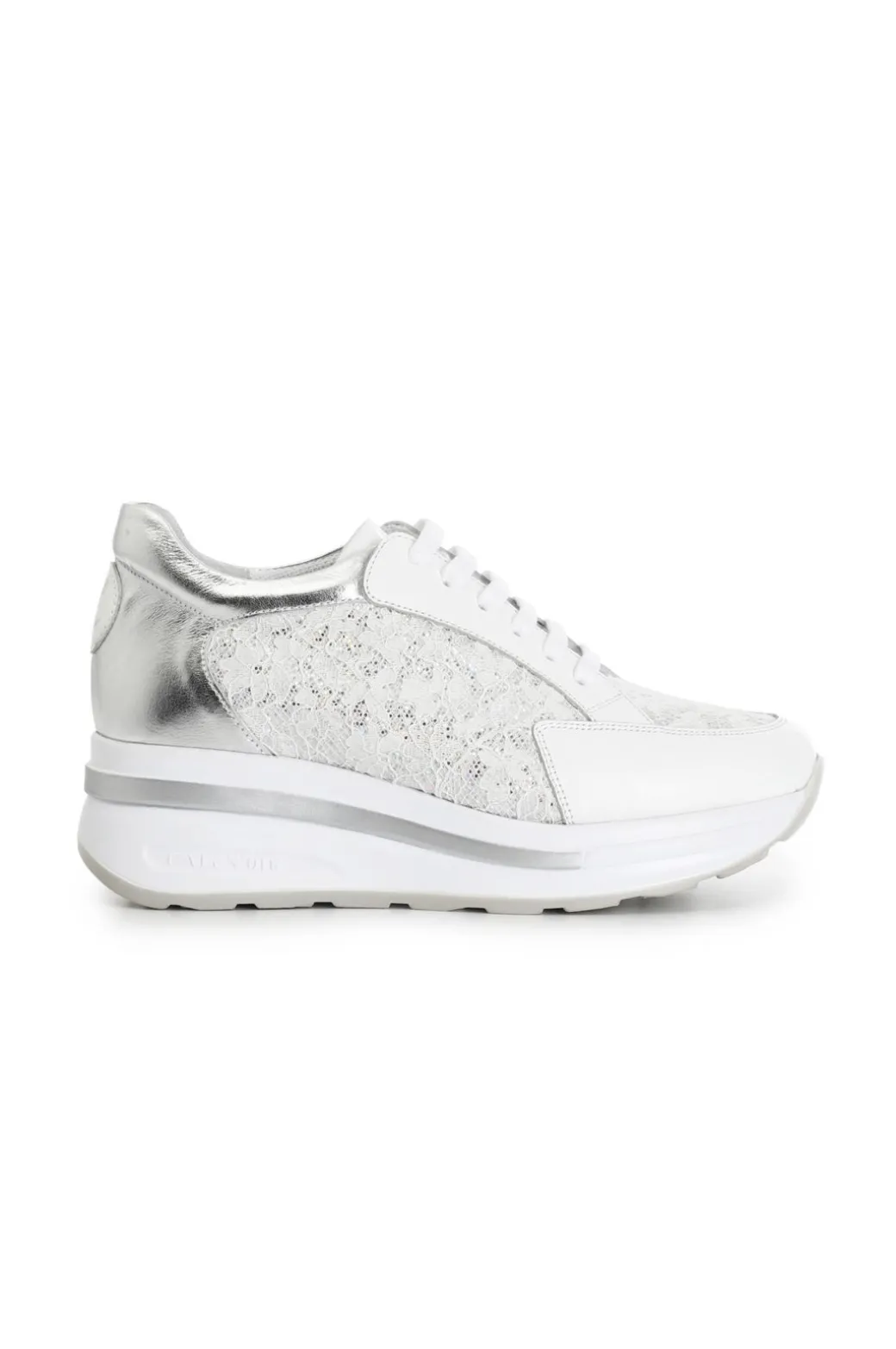 Sneakers in pelle caratterizzata da eleganti riporti effetto pizzo e laminato. suola con zeppa bicolor di 40mm con logo embossed.