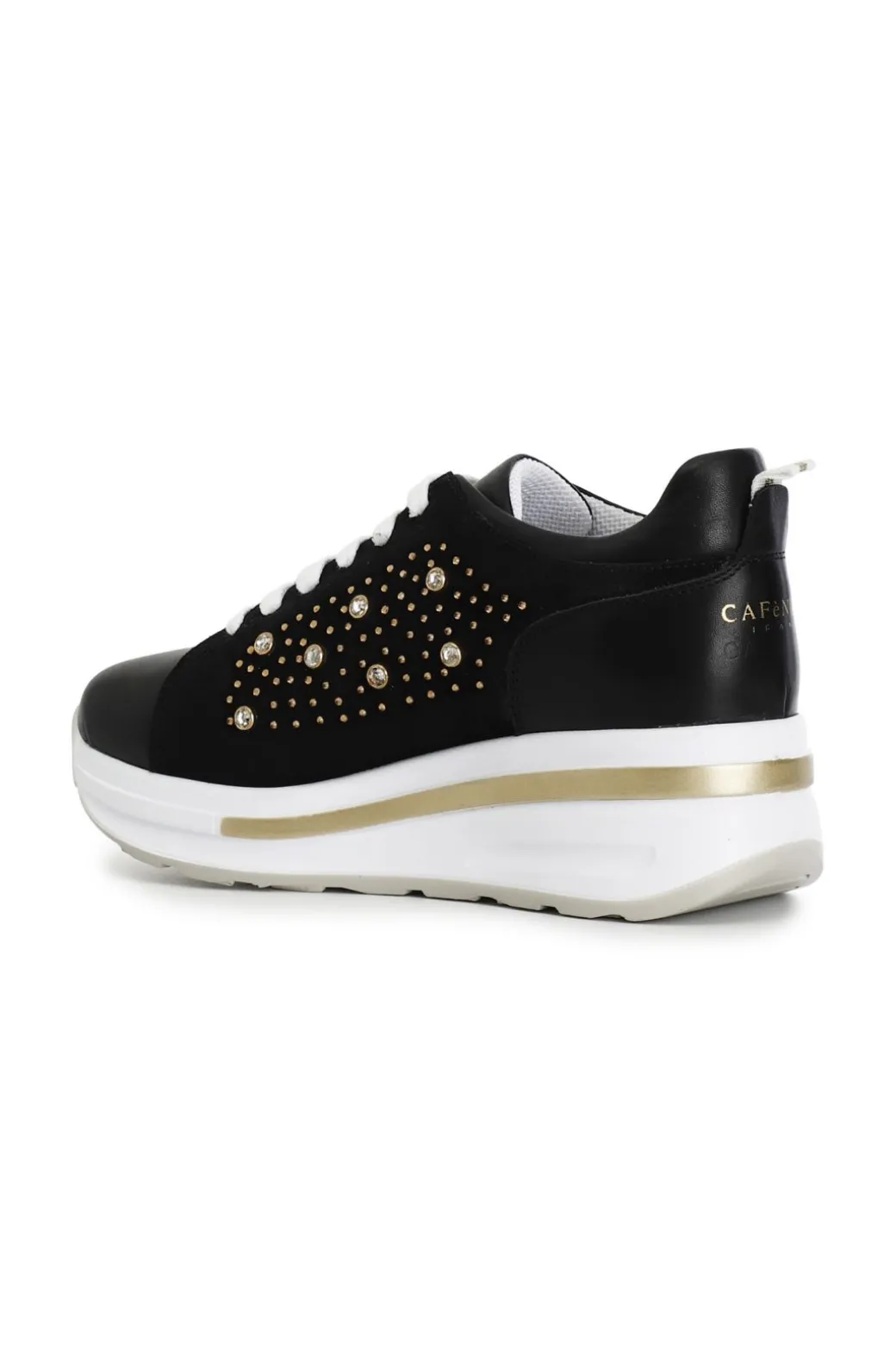 Sneakers in pelle scamosciata con riporti in pelle e motivo di borchie e strass. suola con zeppa bicolor di 40mm con logo embossed.