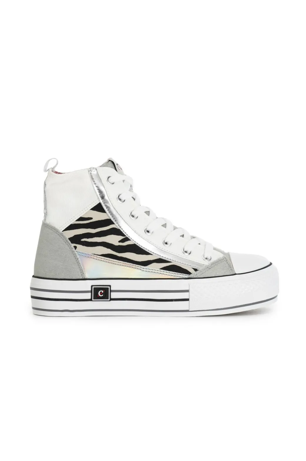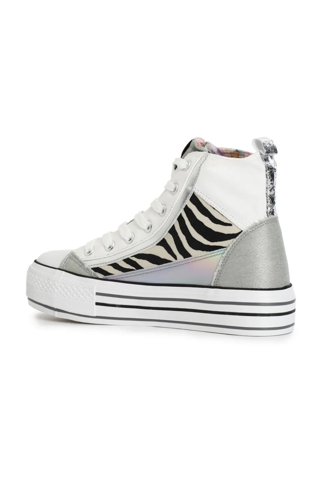 Sneakers mid caratterizzato da un inserto glamour di fantasia zebrata. chiusura con lacci. suola a cassetta da 40mm con dettagli colorati.