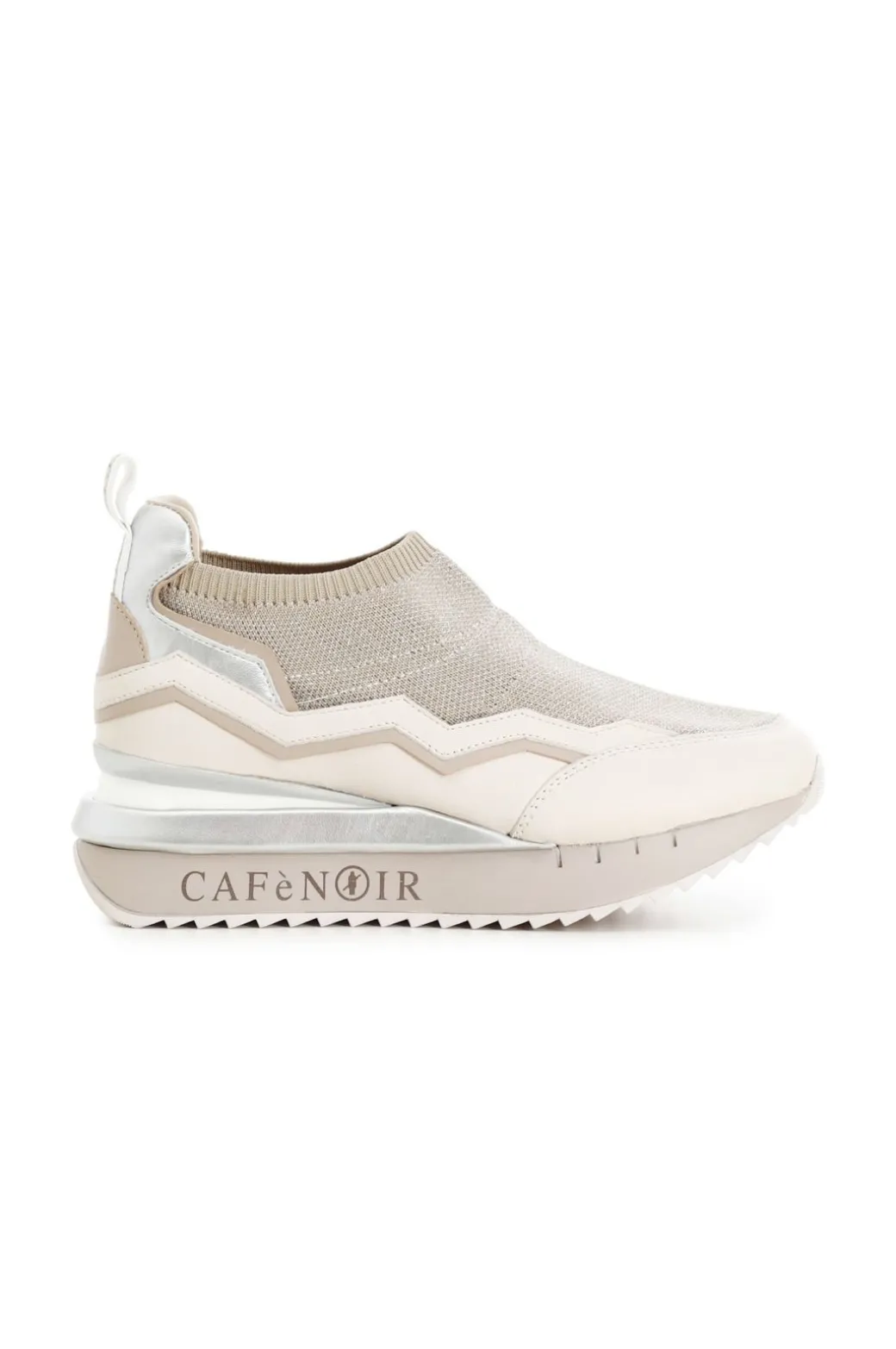 Sneakers slip on in tessuto lurex e pelle suola running con inserto e logo. la sezione in pelle è associata al tessuto tramite un delicato gioco di zig zag delicatamente rifiniti.