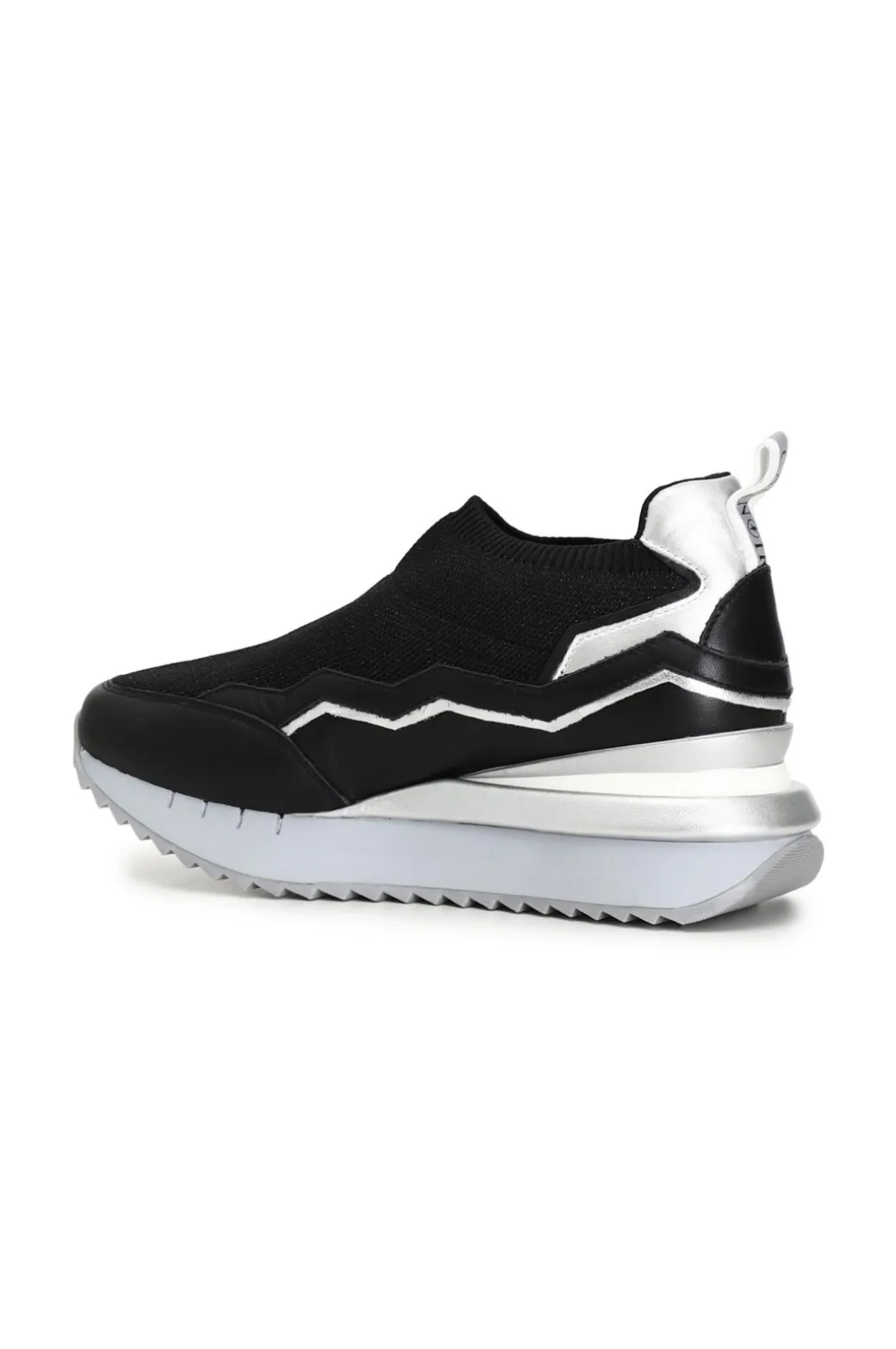 Sneakers slip on in tessuto lurex e pelle suola running con inserto e logo. la sezione in pelle è associata al tessuto tramite un delicato gioco di zig zag delicatamente rifiniti.
