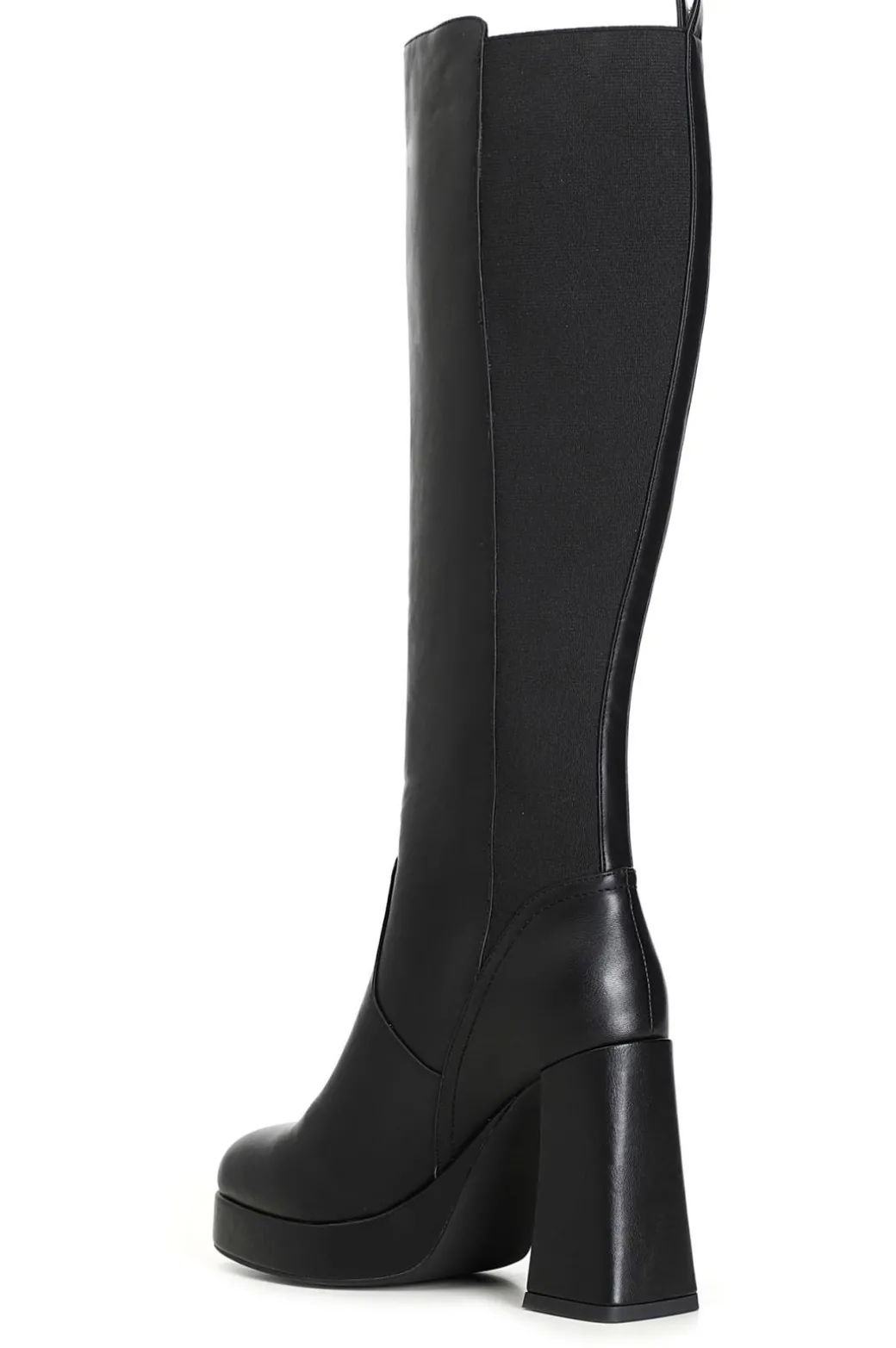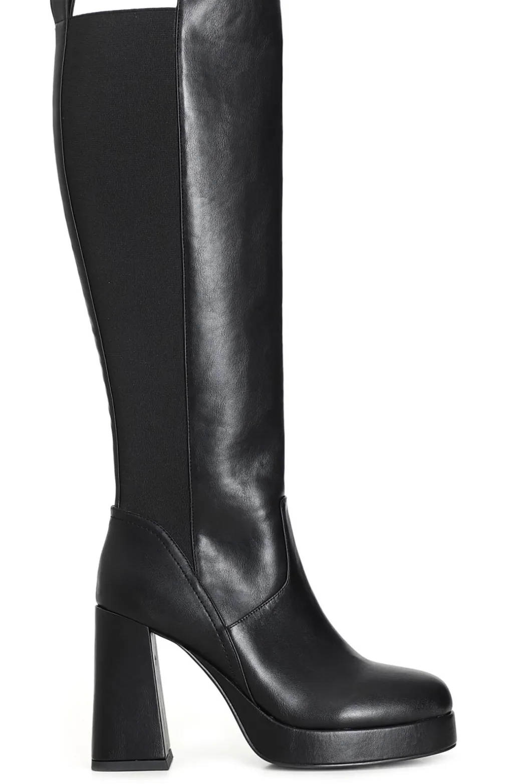 Stivale alto stretch in similpelle con elastico sul retro. plateau di 22 mm e tacco alto 100 mm. forma stondata. il soletto è in pelle. il tutto dona equilibrio tra altezza bellezza e comodità.