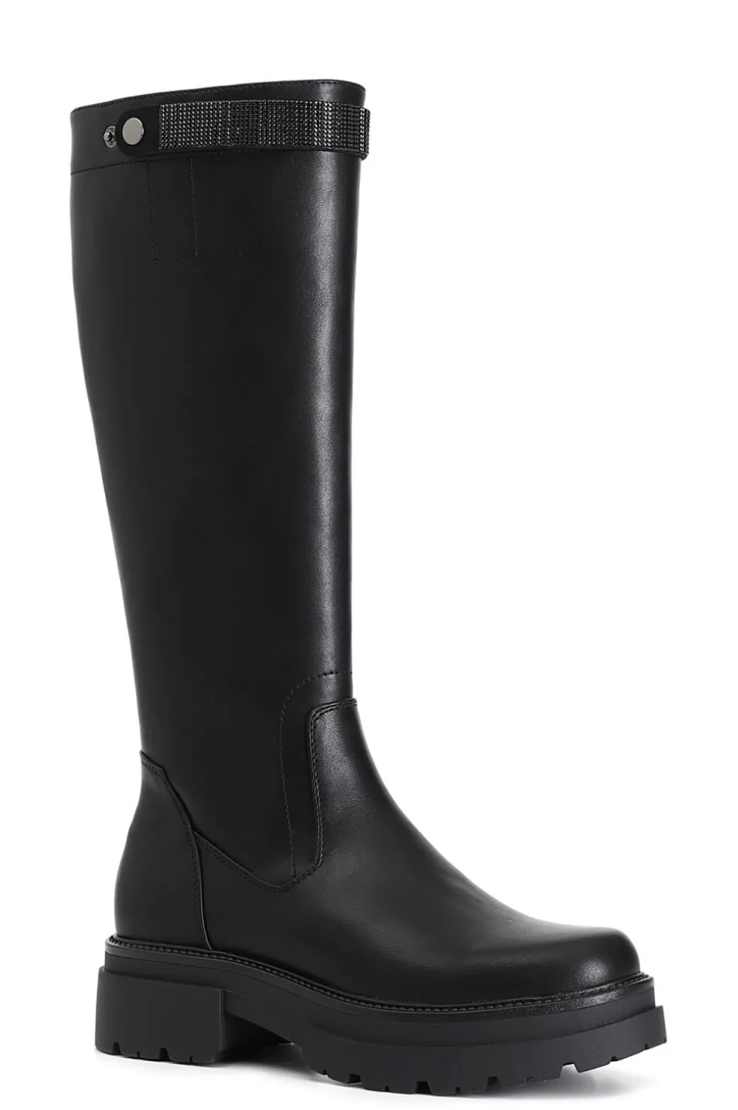 Stivale da donna in similpelle arricchito da un accessorio fatto in strass. il soletto è in pelle.
