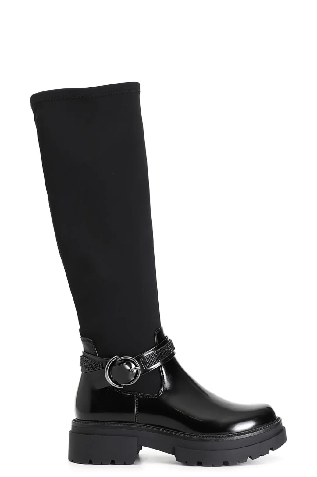 Stivale da donna in similpelle spazzolata con gambale elasticizzato e cavigliera removibile arricchita da strass e fibbia. il soletto in è pelle.
