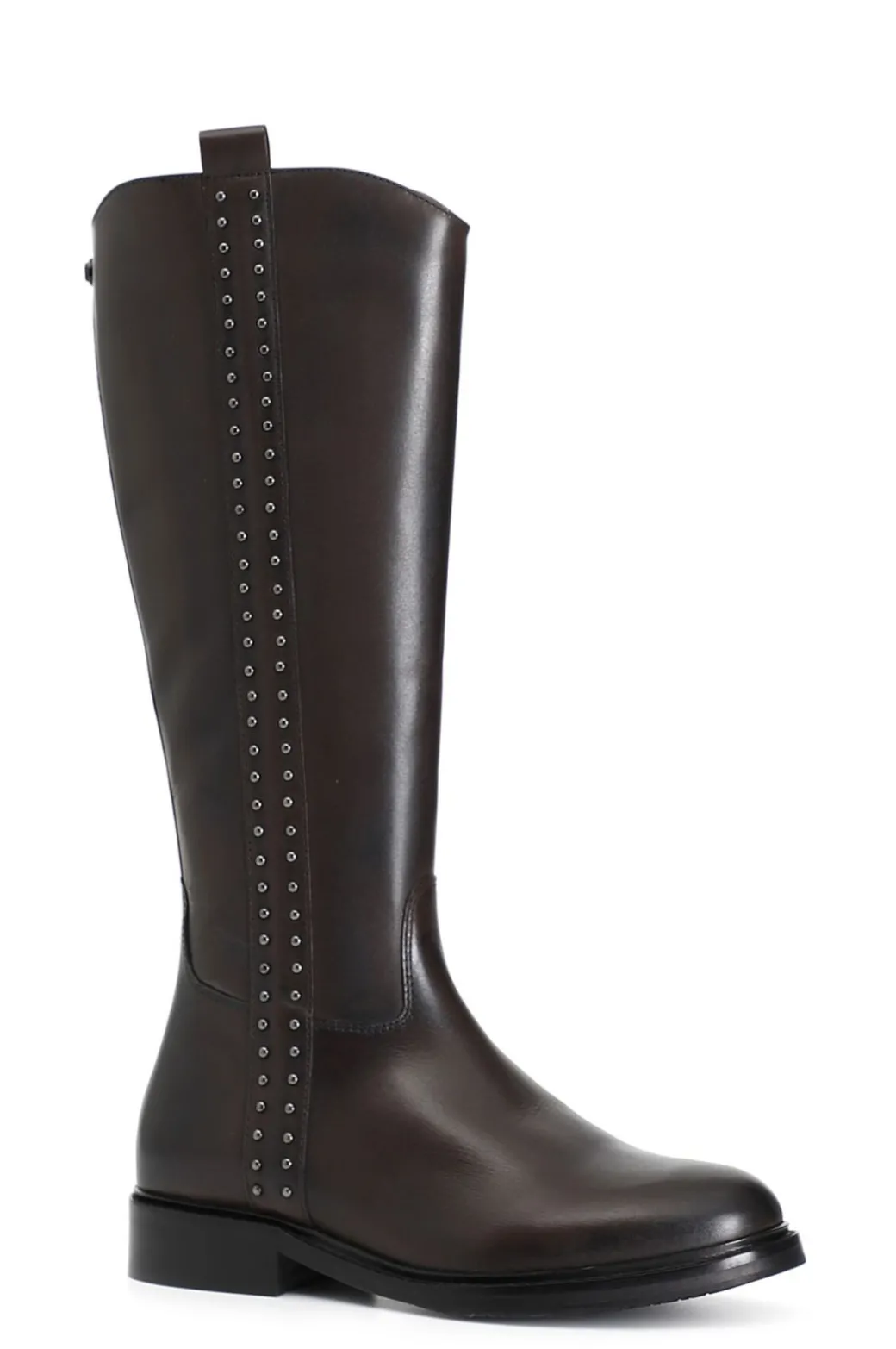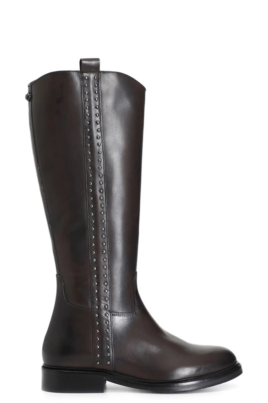 Stivale in pelle con una cascata di borchie laterali che donano allo stesso tempo armonia e dinamicità grazie anche ad gioco di impunture. il soletto è in pelle.
