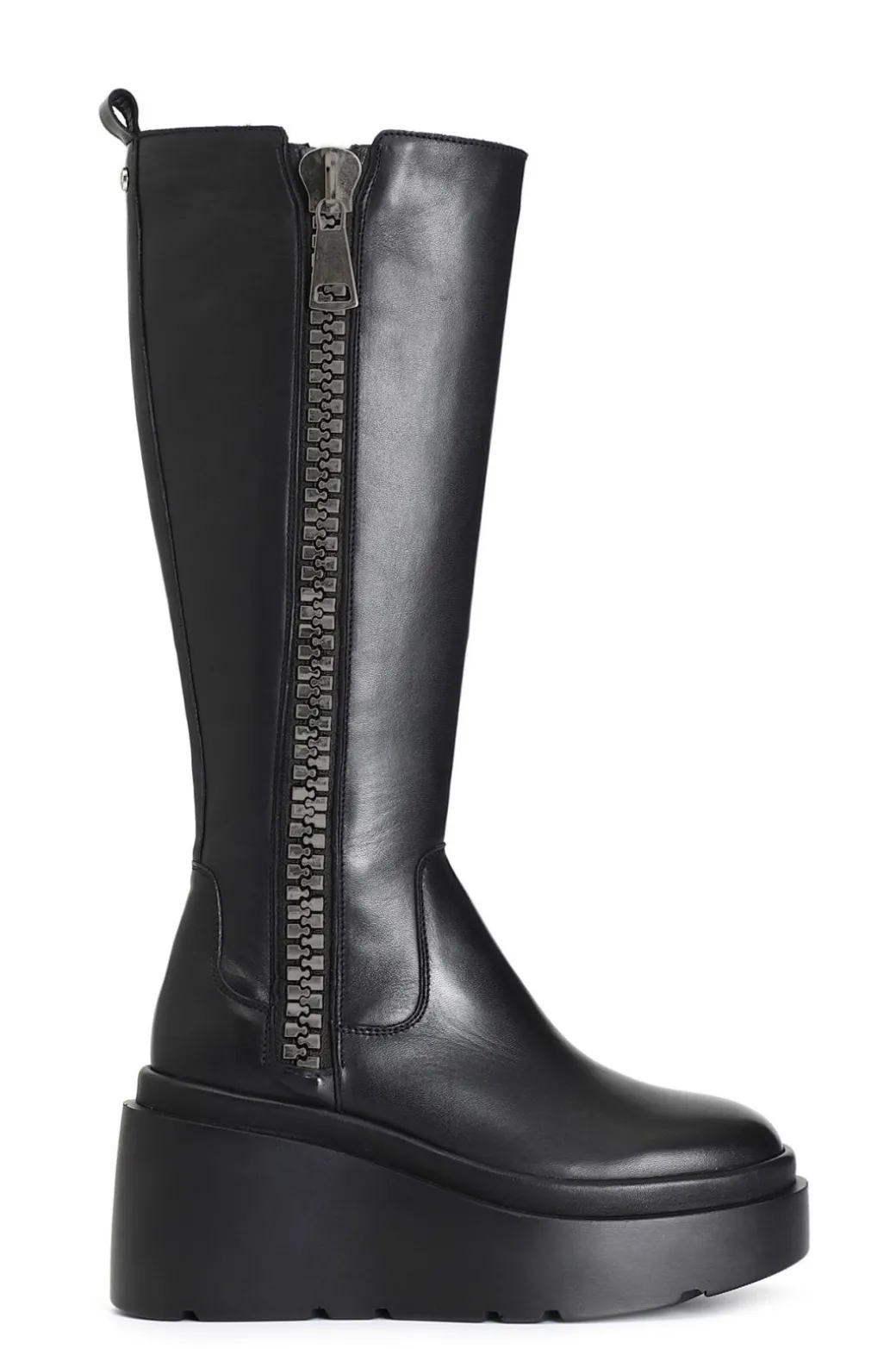 Stivale in pelle con cerniera in metallo a decoro. tacco 70 plateaux 30. cerniera interna come chiusura. tacco 70 mm e plateau 30 mm. il soletto è in pelle.