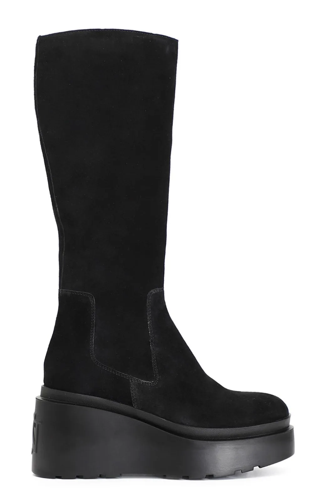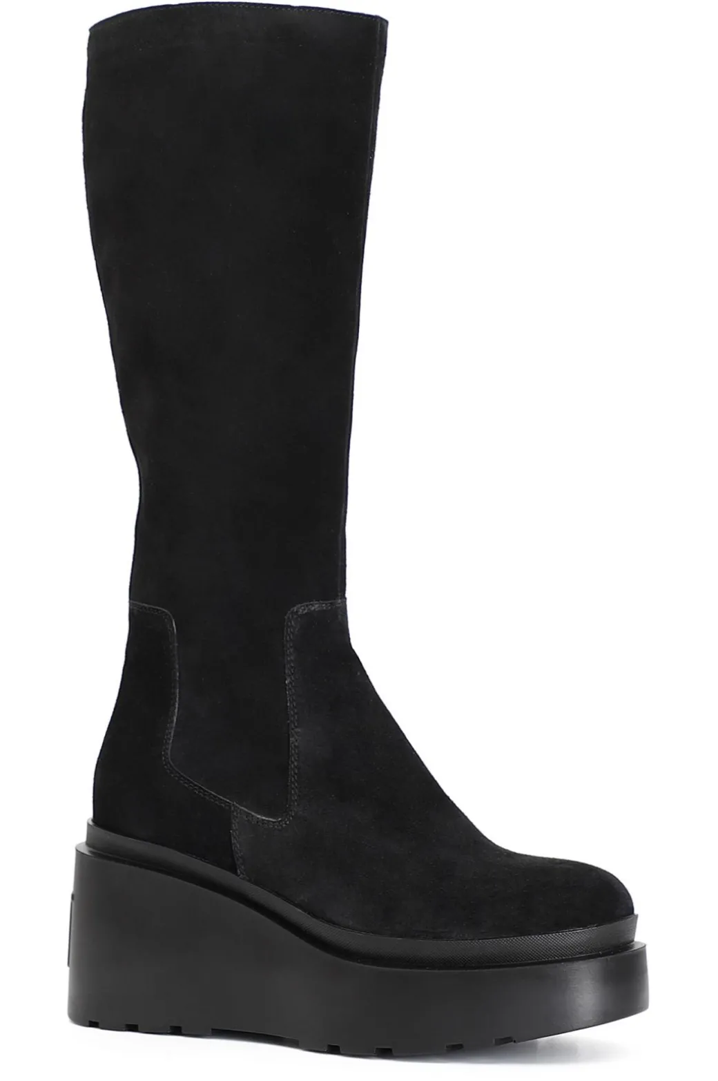 Stivale in pelle scamosciata con pleteau e tacco. soletto in pelle e suola con zeppa personalizzata con logo a rilievo sul retro.
