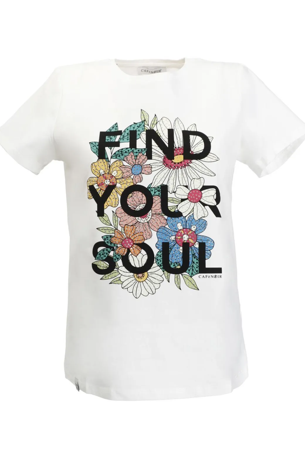 T-shirt a maniche corte in jersey di cotone elasticizzato. la t-shirt riproduce la scritta “find your soul” e una pioggia di fiori colorati arricchiti da strass.