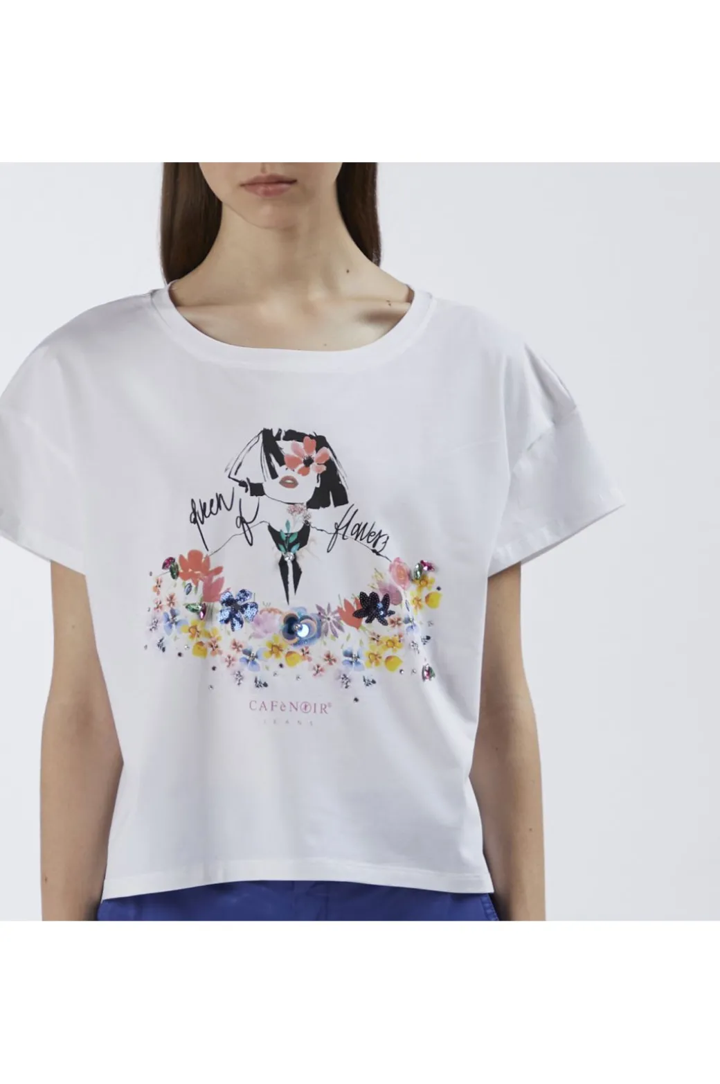 T-shirt a scatolina a maniche corte realizzata in jersey di cotone elasticizzato. elegante riproduzione di un volto femminile e dei fiori. la grafica è arricchita da strass incastonati ad elementi tridimensionali.