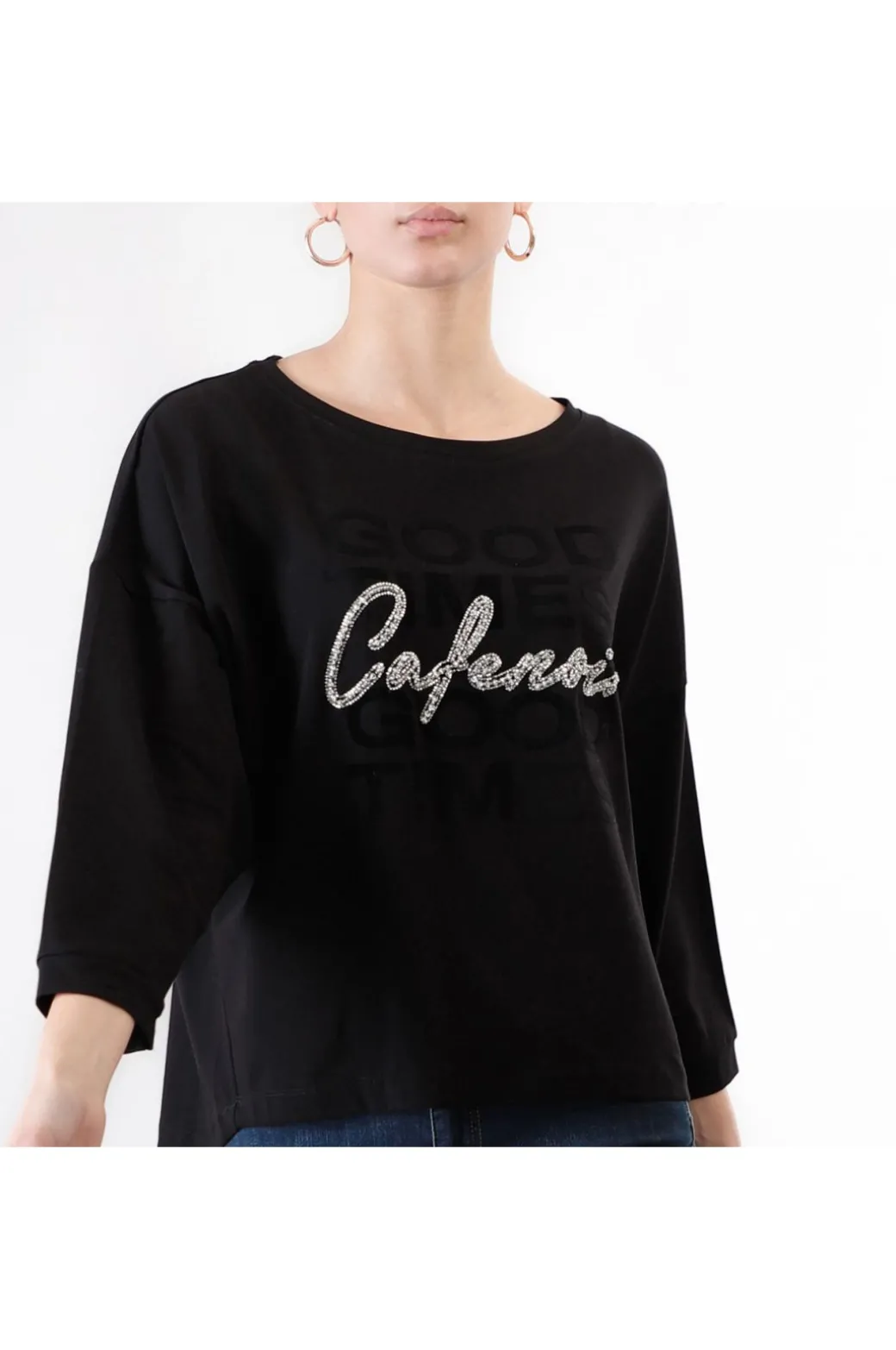T-shirt a manica lunga a pipistrello realizzata in cotone elasticizzato stampa floccata “good times” e logo cafènoir ricamato.