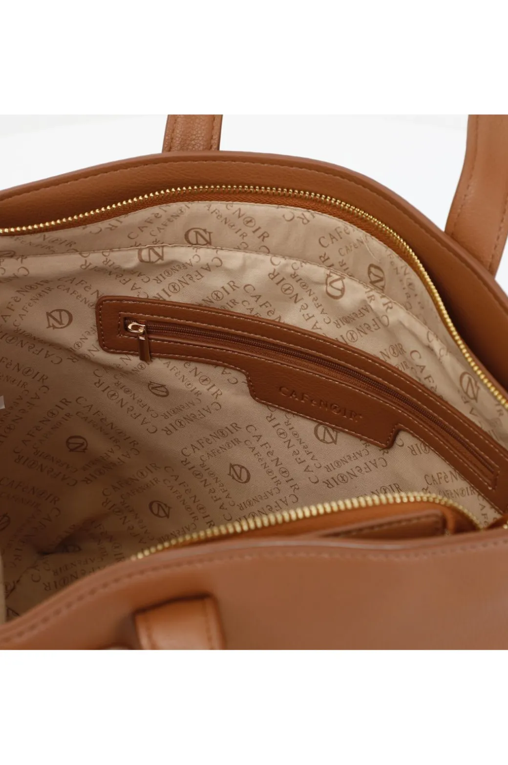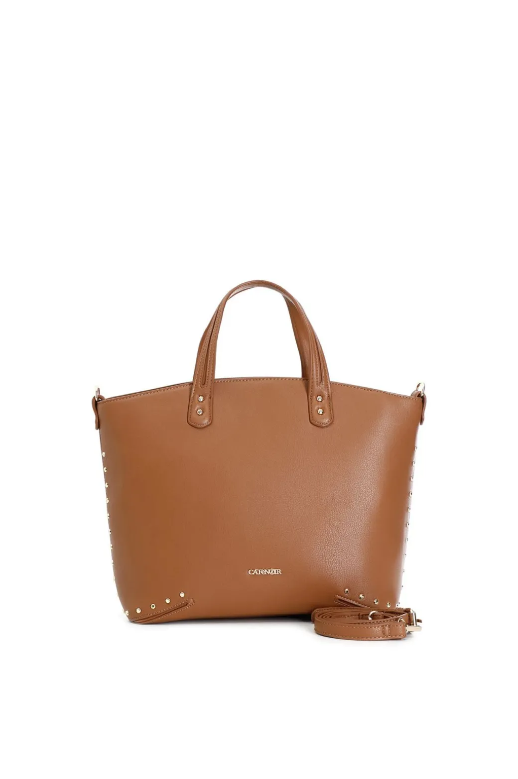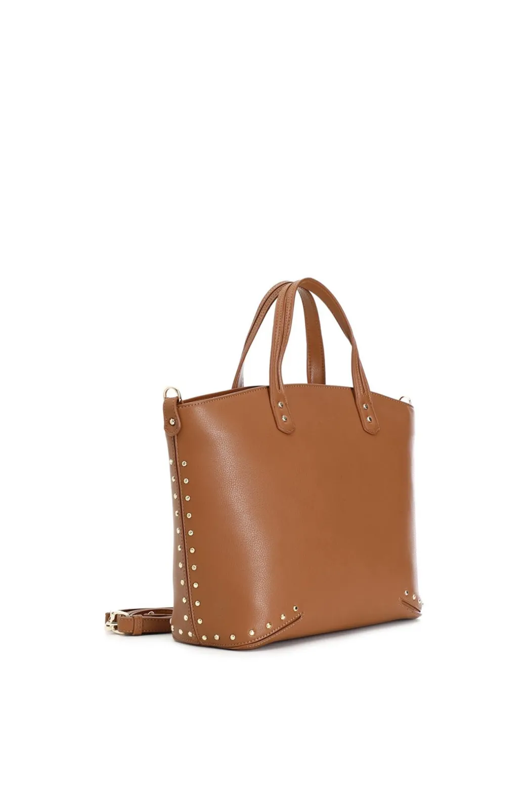 Tote rigida con manici. applicazioni di rivetti laterali e sugli angoli. chiusura con zip. borsa provvista di un comodo scomparto e di un taschino con chiusura a cerniera. borsa dotata di tracolla.