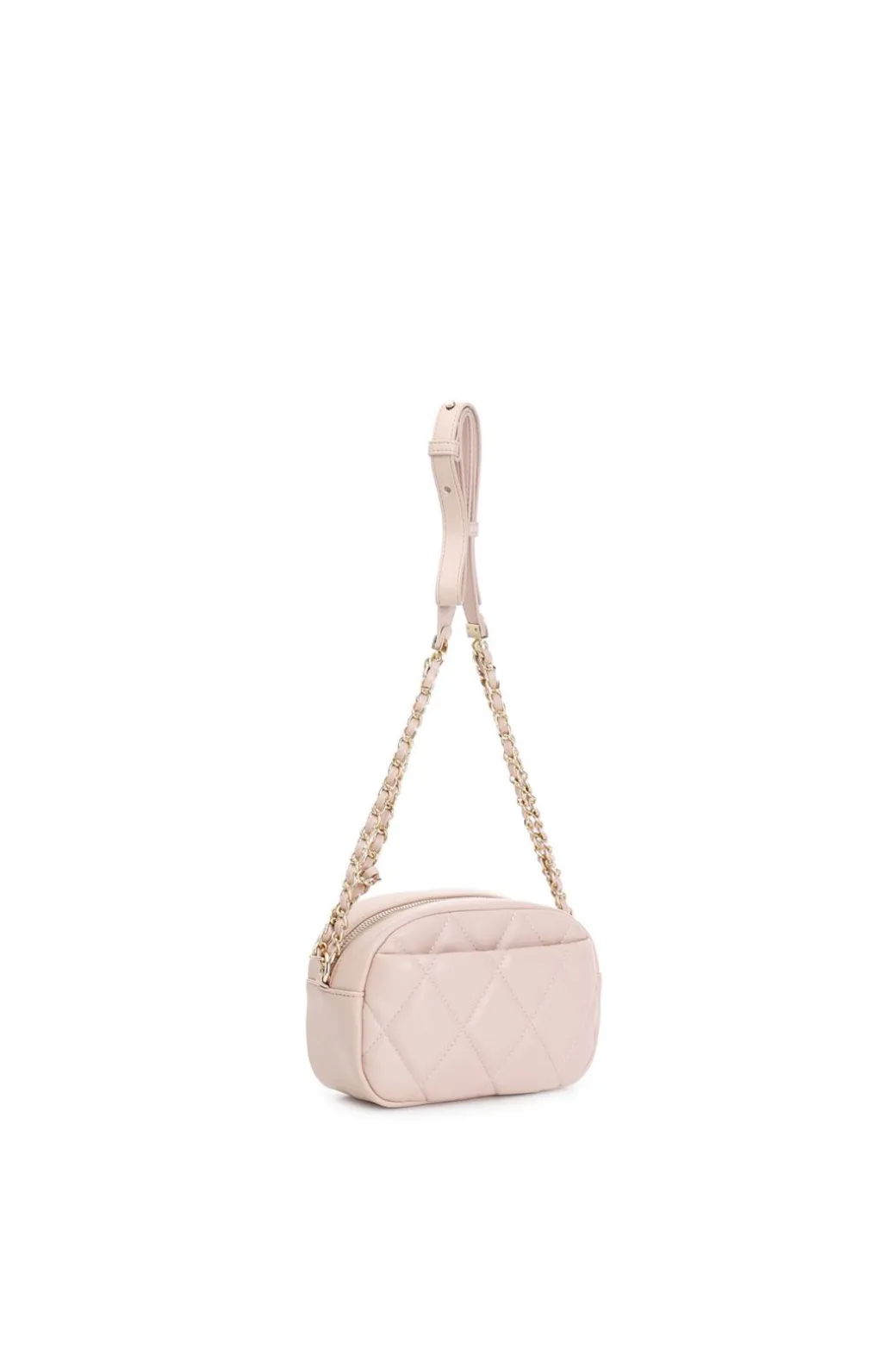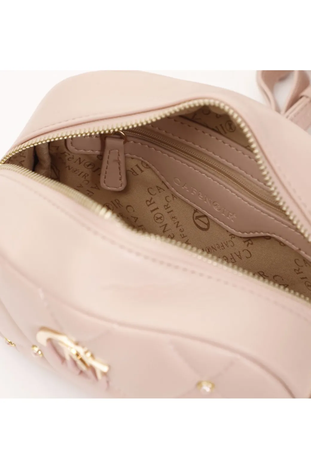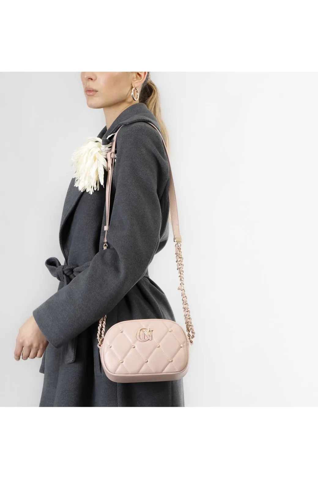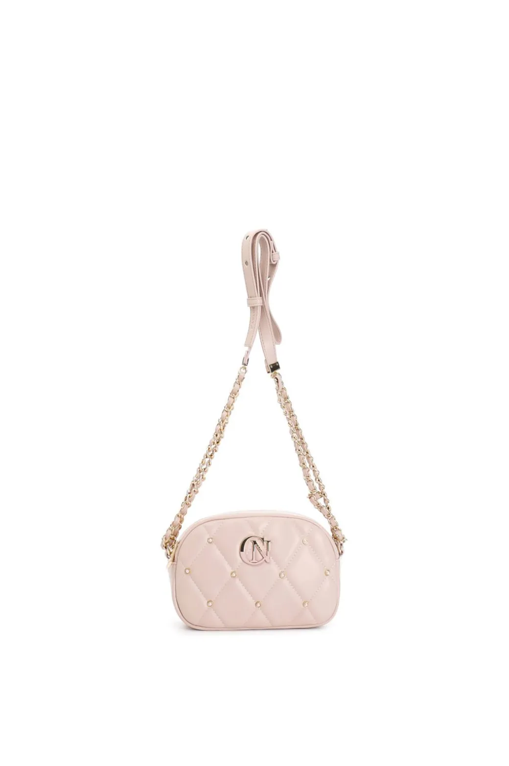 tracolla con trapunta a rombi con applicazione di rivetti e logo bicolore cipria