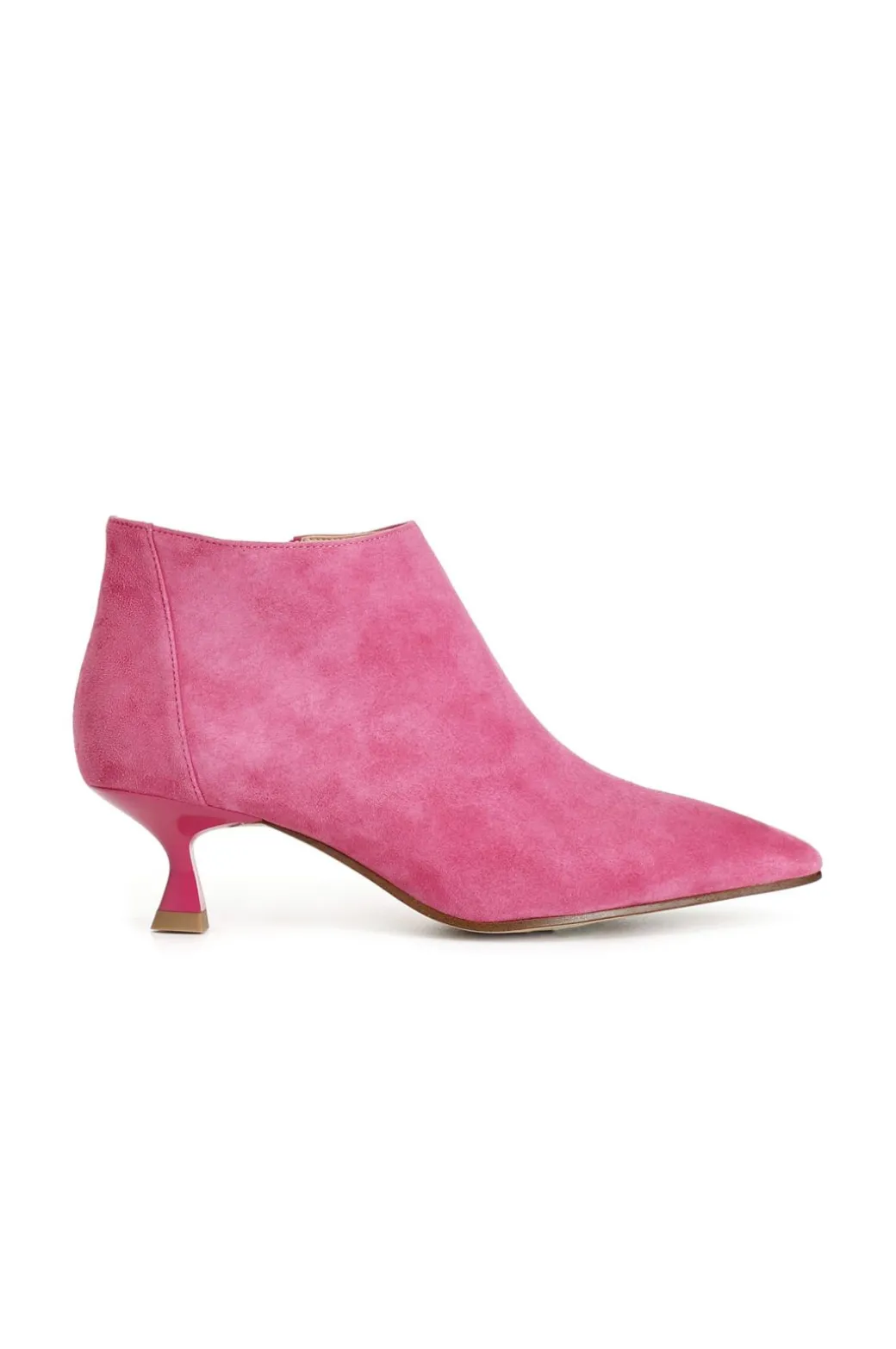 Tronchetti affusolati in pelle scamosciata con zip laterale interna per facilitare la calzata. tacco a rocchetto alto 45mm. calzatura alla moda ma indossabile anche nel quotidiano per soddisfare le esigenze di uno stile di vita dinamico.