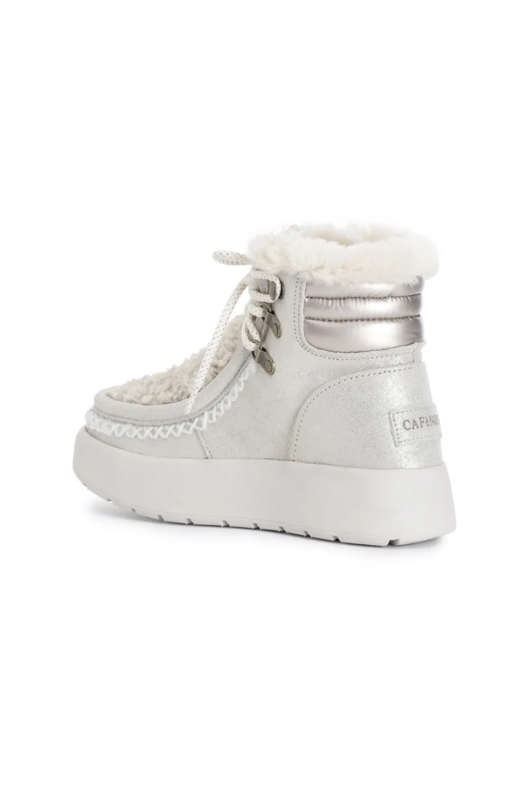 Tronchetto da donna con plateau allacciato sul gambale con bordo mocassino in pelle scamosciata laminata. interno in pelliccia sintetica.