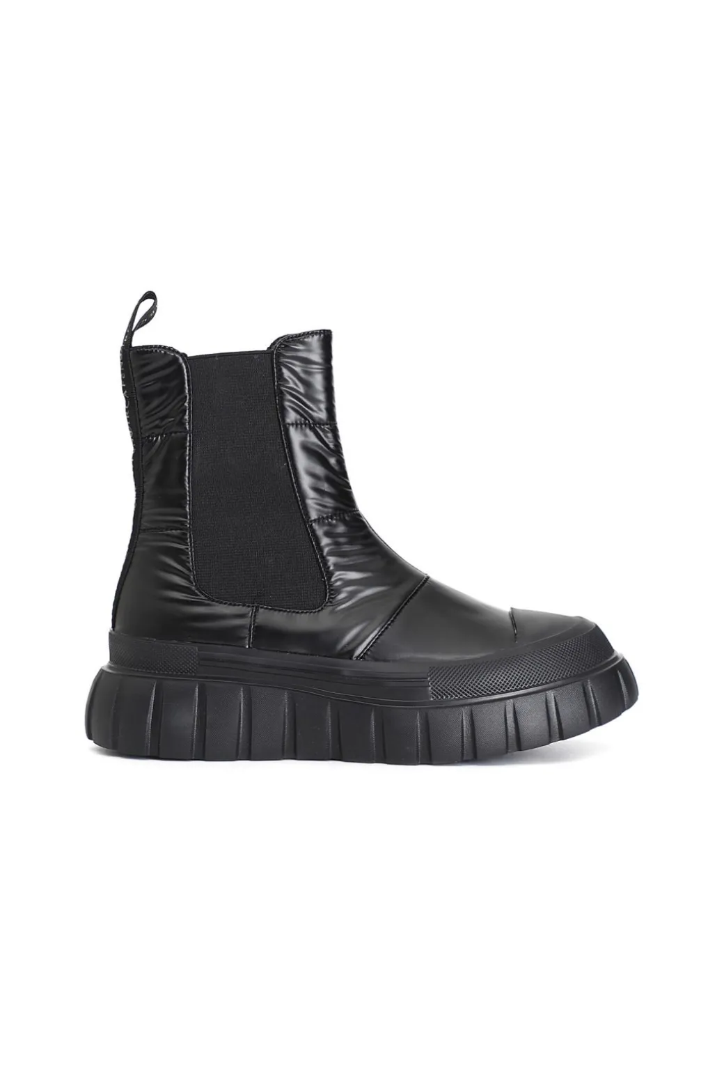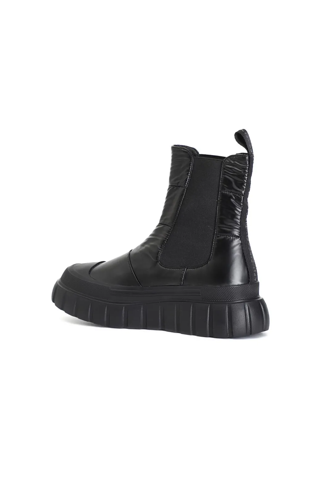 Tronchetto dallo stile sportivo con elastici sulla parte laterale della calzatura per agevolare la calzata. tomaia in tessuto laminato con imbottitura trapuntata. suola rialzata caratterizzata da un particolare motivo rigato.