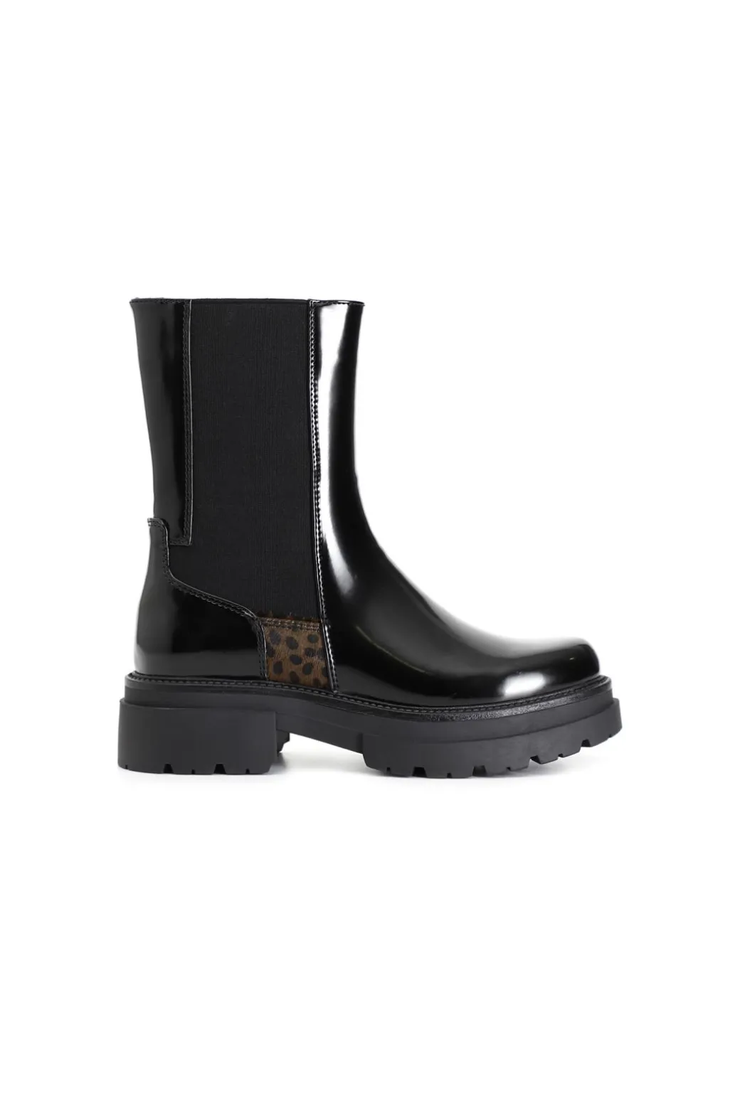 Tronchetto da donna in similpelle spazzolata con elastico laterale sul gambale impreziosito da un inserto in cavallino. il soletto è in pelle.