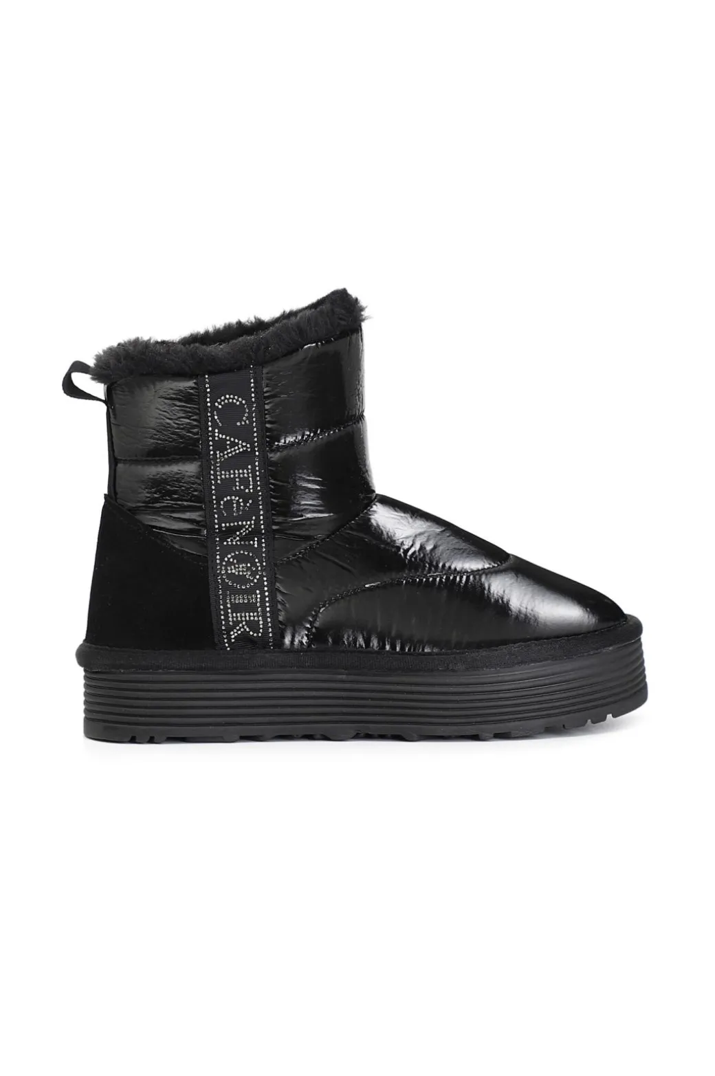 Tronchetto in nylon impreziosito da un nastro con logo cafènoir fatto di strass la fodera è in pelliccia sintetica. plateau alto 35mm