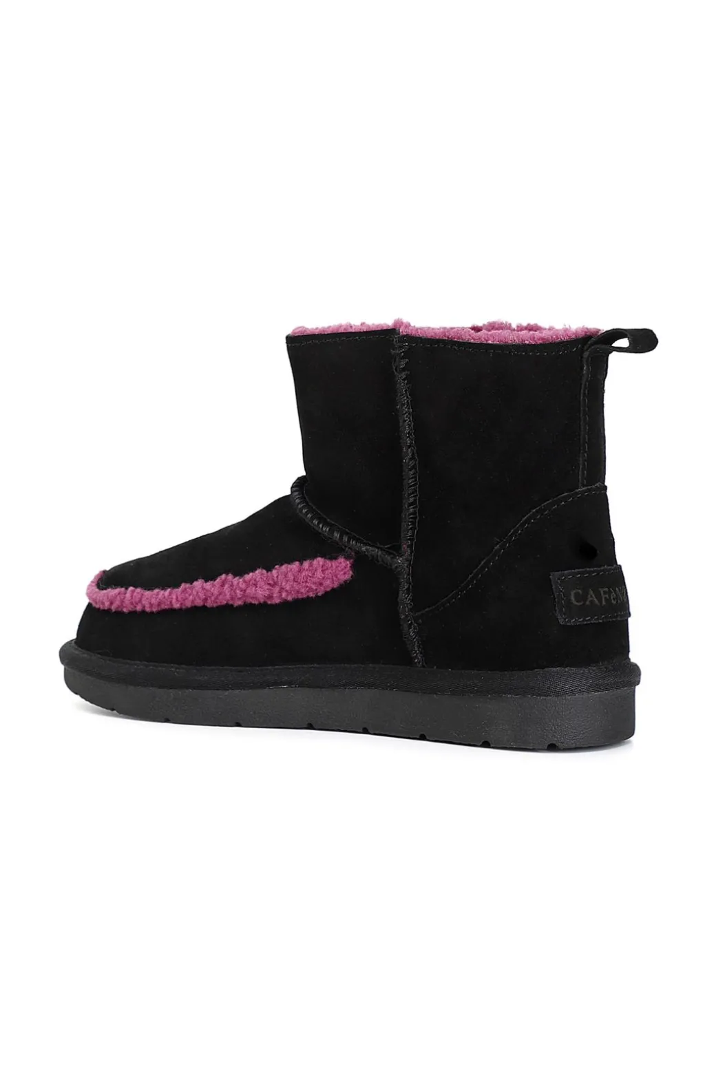 Tronchetto in pelle scamosciata con interno in pelliccia sintetica arricchito da un simpatico inserto a contrasto.