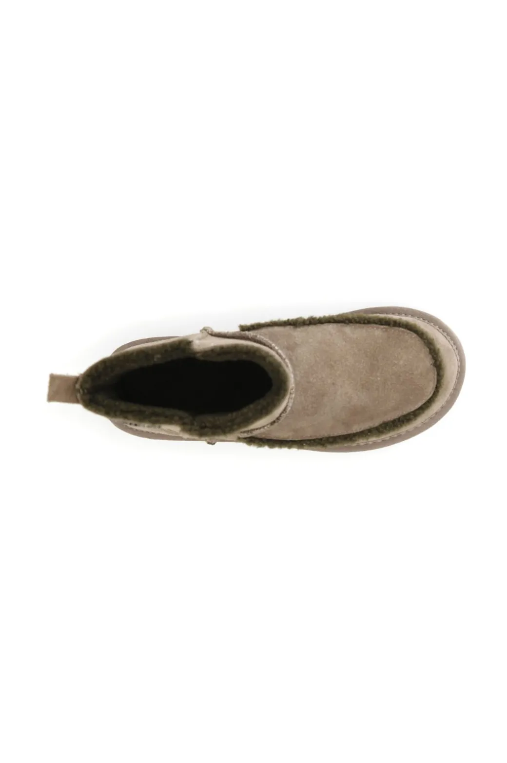 Tronchetto in pelle scamosciata con interno in pelliccia sintetica arricchito da un simpatico inserto a contrasto.