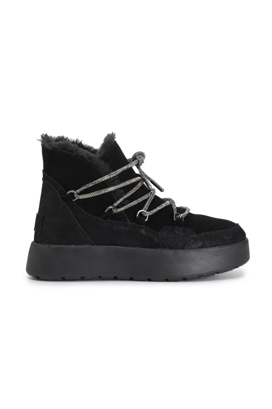 Tronchetto da donna con plateau. tomaia in pelle scamosciata interno in pelliccia sintetica. dettaglio della calzatura: laccio in strass.