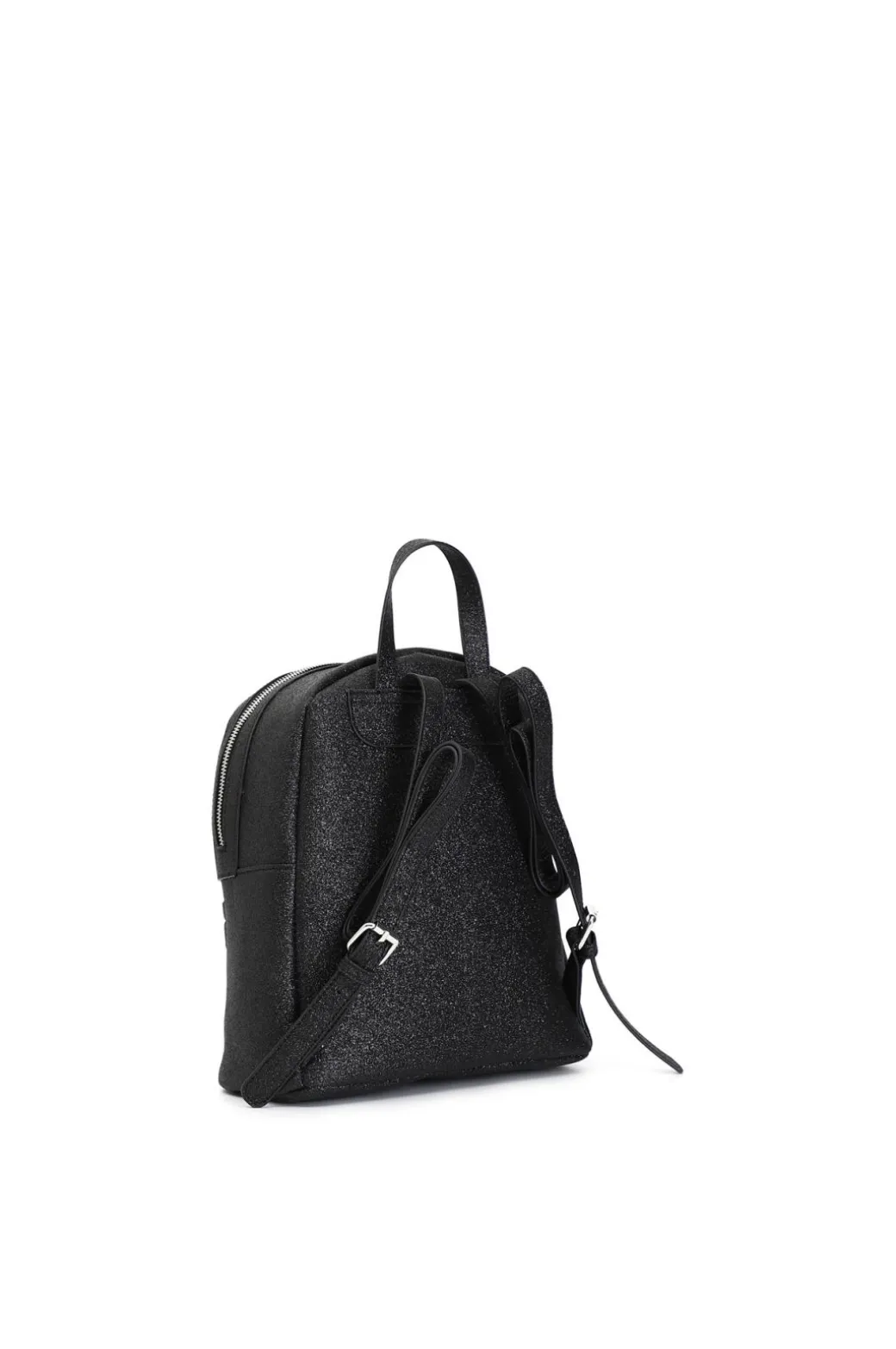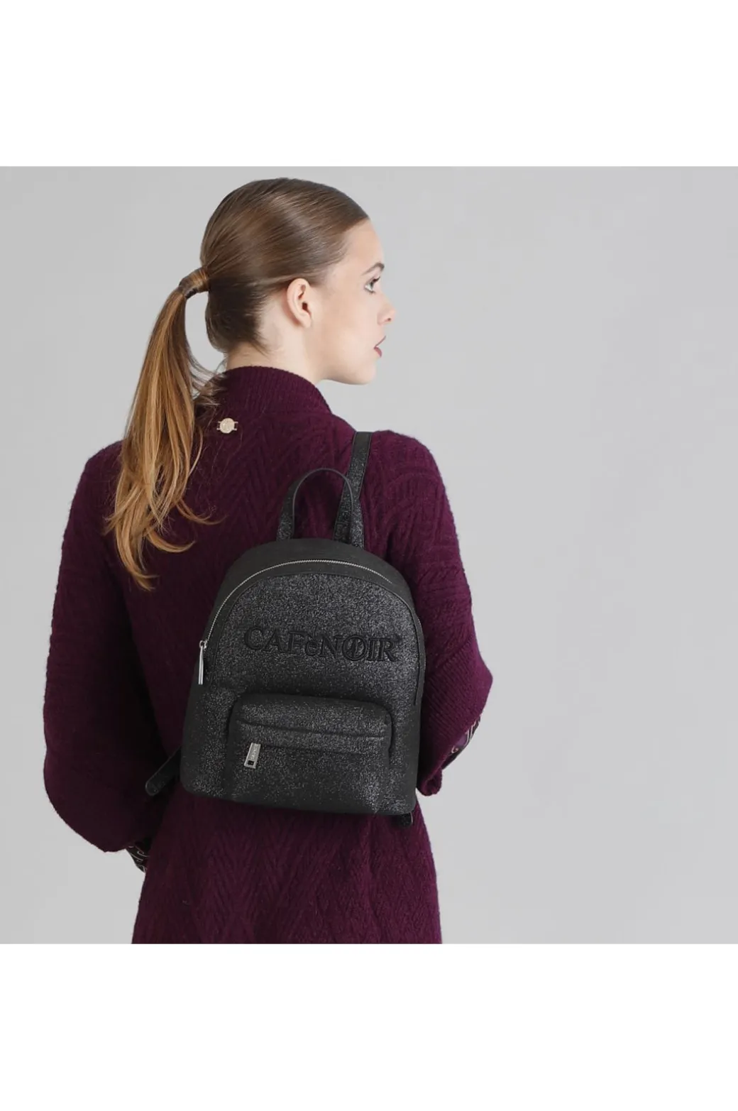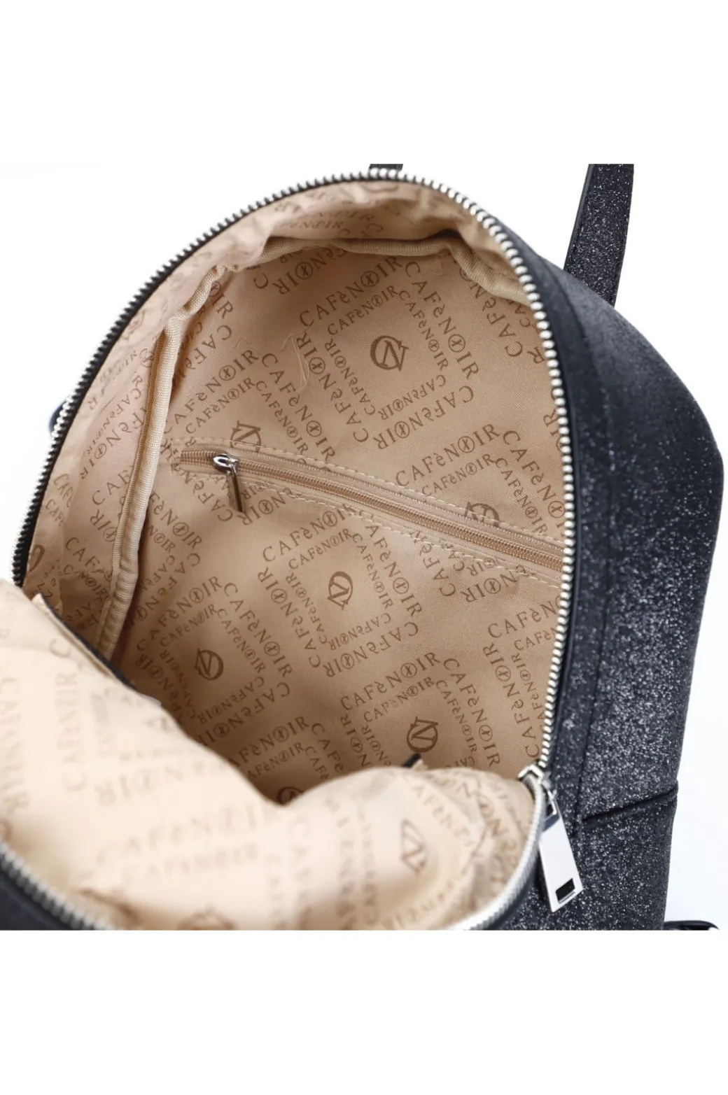 Zaino glitterato nero con zip. logo cafènoir ricamato. tasca con zip frontale. spallacci regolabili.