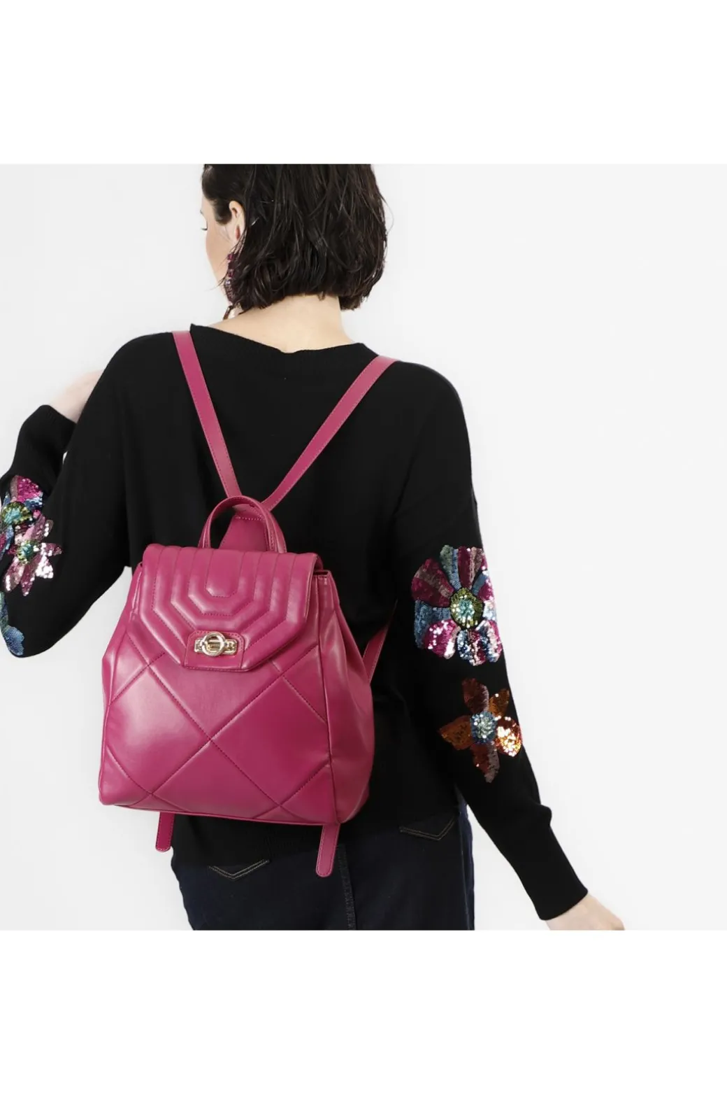 Zaino trapuntato con motivo a rombi e pattina trapuntata con motivo a righe. chiusura in metallo personalizzata. spallacci regolabili.